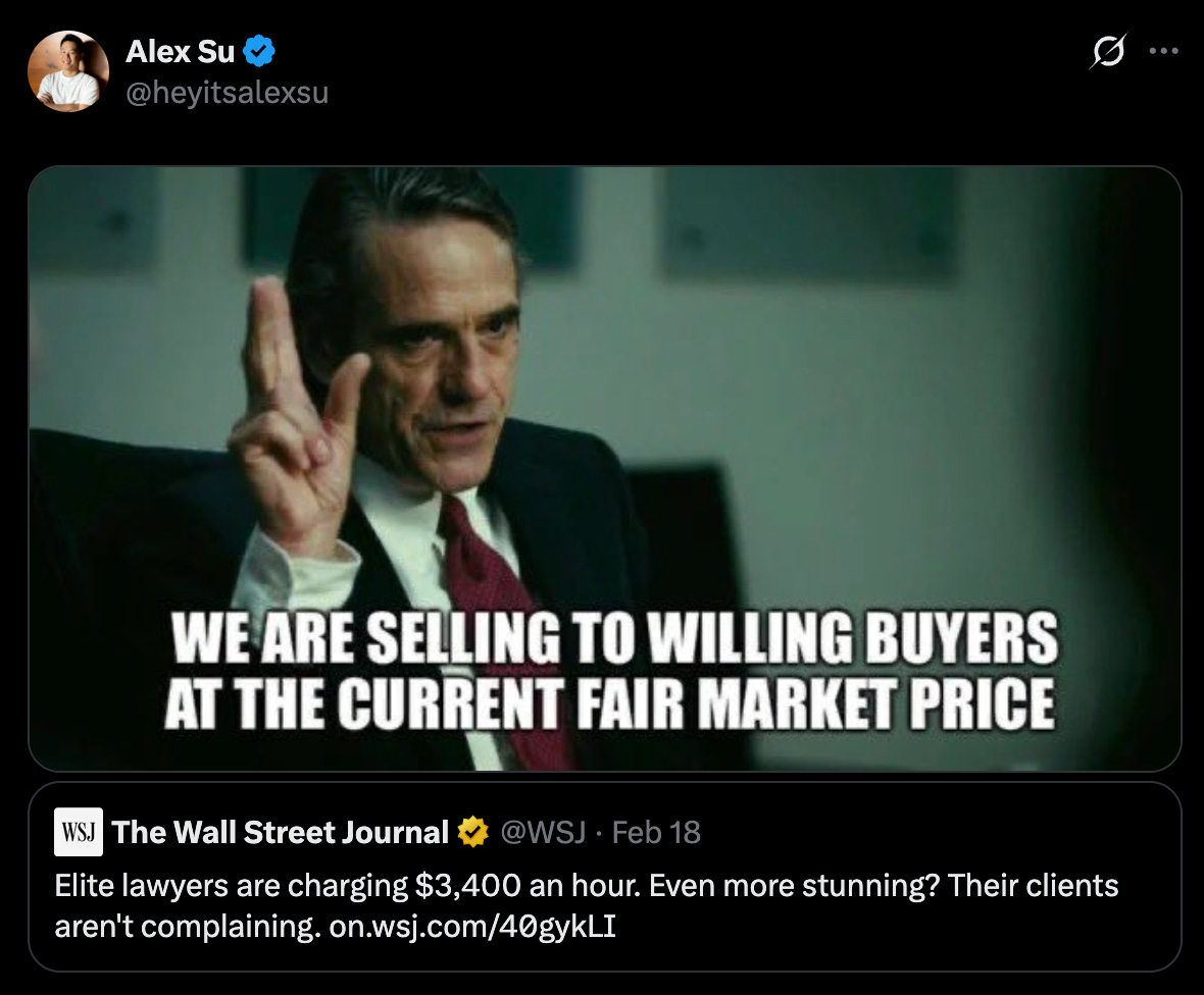 Earlier this week, the Wall Street Journal reported that some law firms are now charging up to $3,400 per hour. Which led me to share my immediate reaction on social media: