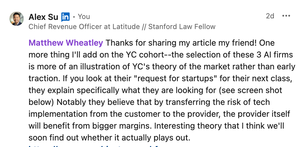 I’m always fascinated by what YC does because it’s usually a leading indicator of what the VC world/tech community is thinking about legal innovation. Here, at its core, this drive towards AI-enabled firms is a margin expansion thesis.2